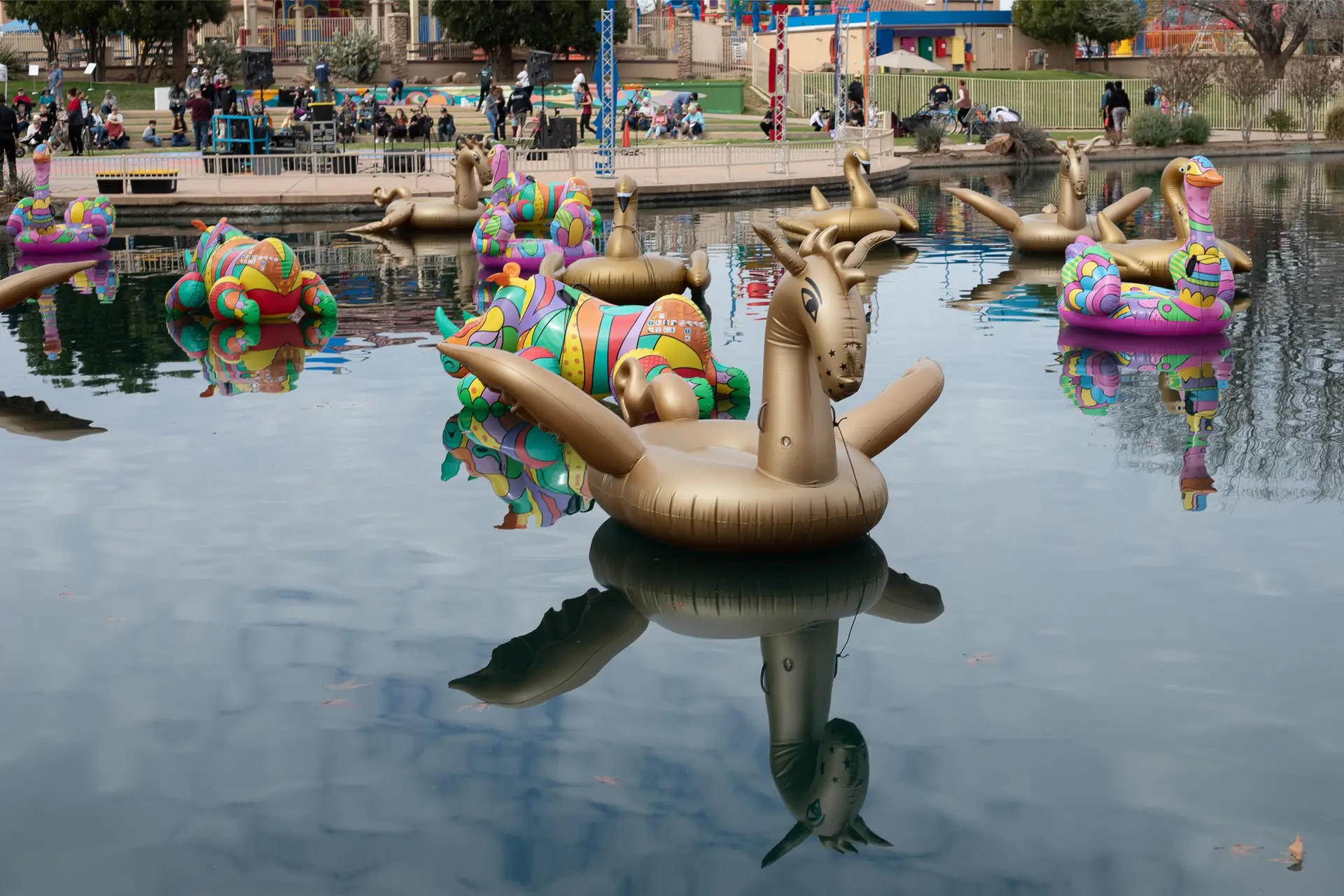 The lake transforms into a canvas of community expression.